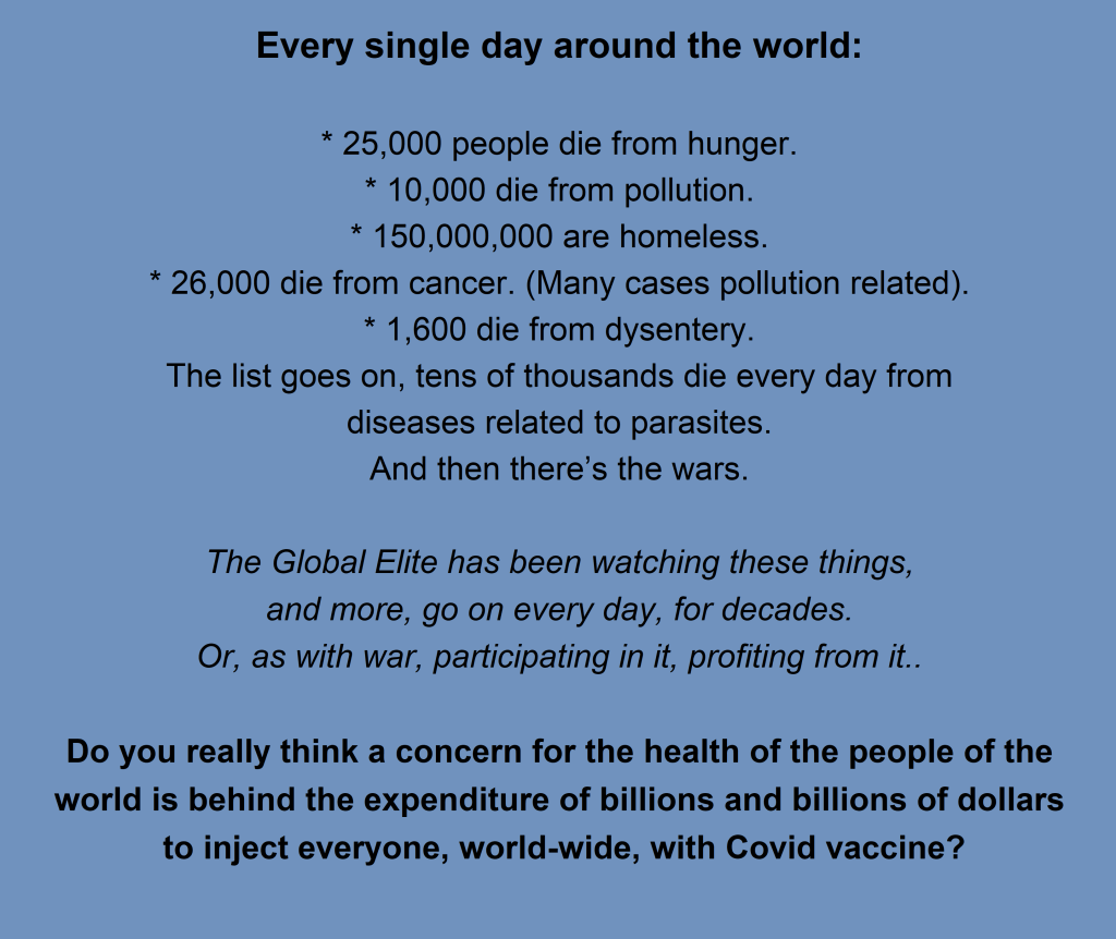 It should be noted that while over 99% of people are simply going to survive Covid, the same can’t be said for starvation, and all the other afflictions mentioned above. So, if a group of politically powerful, medically knowledgeable, altruistic people decided to save a lot of people and have the money to do so, why not start with where it will save the most lives? Eradicate hunger. That would save over twice as many lives on a daily basis as eradicating Covid-19. The current numbers within the U.S. alone are evidence that the human immune system is over 99% effective in fighting off Covid. That is better than the questionable 95% effective claim of the vaccine manufacturers. The many billions of dollars which have been spent and will be spent on development of a vaccine, distribution and mass injections, could have ended starvation, made a big dent in homelessness (if not ended it completely), and/or addressed many of the other debilitating conditions humanity faces on a daily basis. And has for decades. So why now, why Covid? Why are accounts which have been totally closed to those in dire need in the world suddenly pouring money at Covid under the banner of caring for the people of the world?