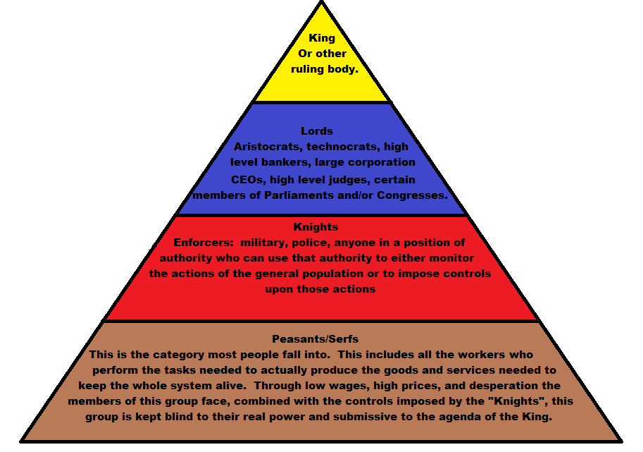 The above pyramid roughly illustrates the composition of the 21st century feudal system that is being engineered into existence. However, it is not absolute in it’s designations. For instance, many Presidents, Prime Ministers, and other national heads of state fall in the category of “Lords” rather than being part of the actual international ruling/governing body. And some with a high level of a particular skill which is needed by the ruling body may find themselves at least honorary members of the “Lords”.